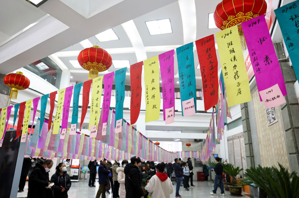 2月22日,在甘肃省兰州市图书馆,市民在猜灯谜。新华社发(侯崇慧摄)
