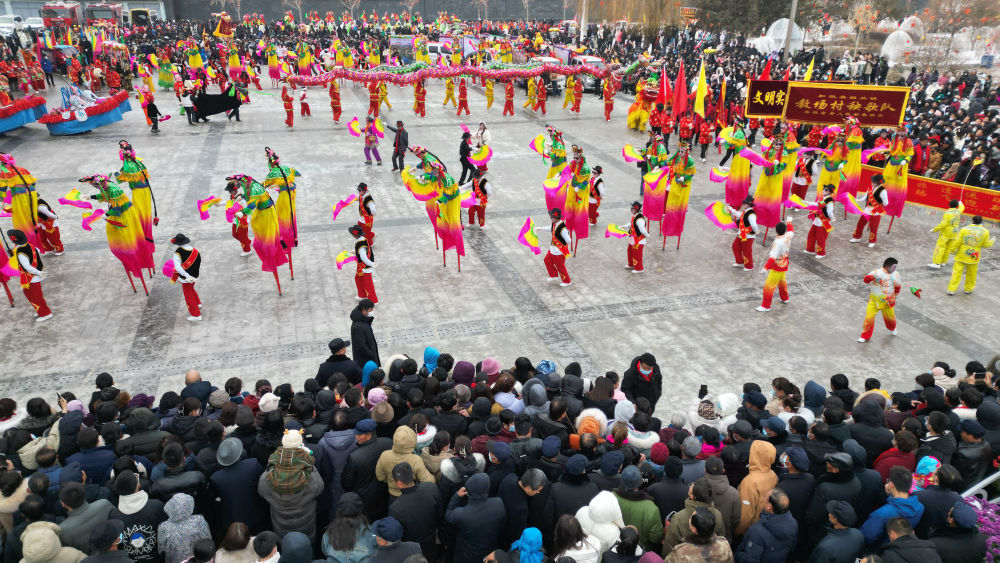 2月22日,秧歌队员在甘肃省和政县聚兴广场表演秧歌(无人机照片)。新华社发(史有东摄)