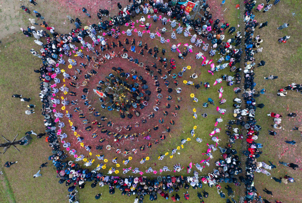 2月22日,村民在广西柳州市融水苗族自治县安太乡举行的正月十三坡会上表演(无人机照片)。新华社发(龙涛摄)