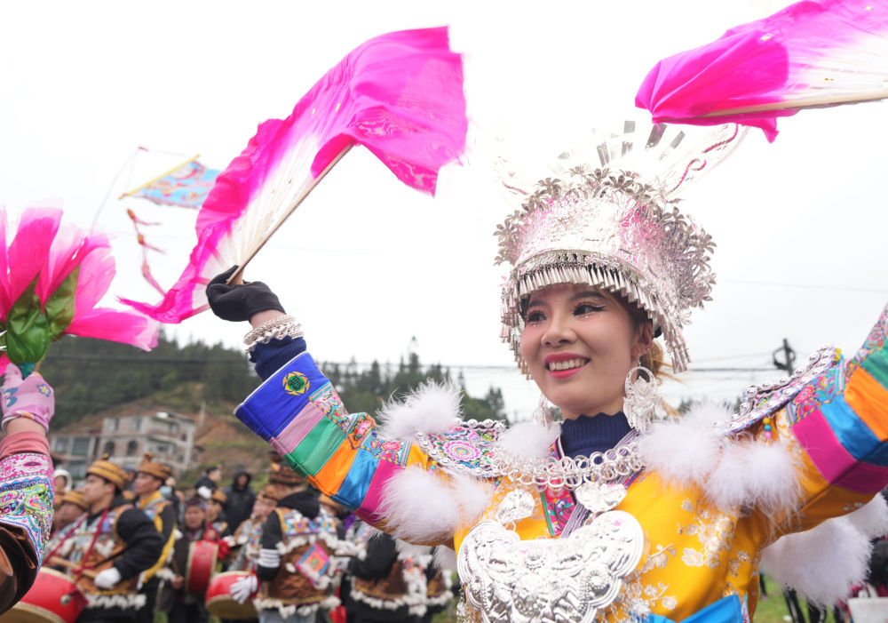 2月22日,芦笙队在广西柳州市融水苗族自治县安太乡举行的正月十三坡会上表演(无人机照片)。新华社发(龙涛摄)