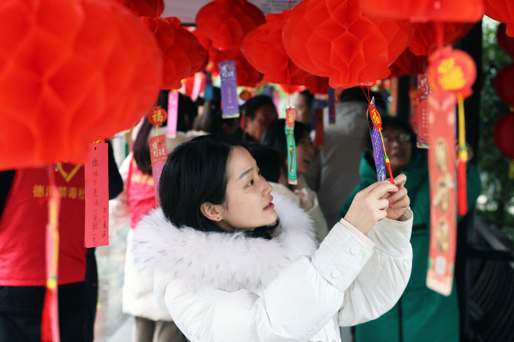 2月22日,在浙江省湖州市德清县乾元镇法治长廊,居民参与法治知识为主题的猜灯谜活动。新华社发(倪立芳摄)