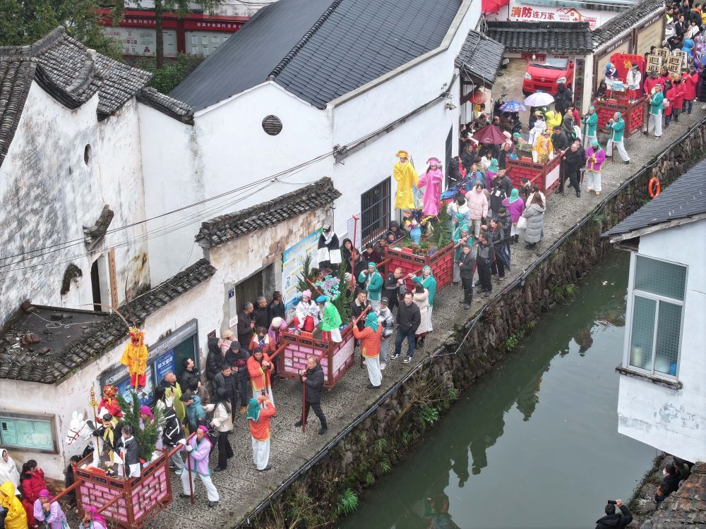 2月22日,在浙江省金华市武义县俞源乡俞源古村,村民举行传统民俗活动“擎台阁”(无人机照片)。新华社发(张建成摄)
