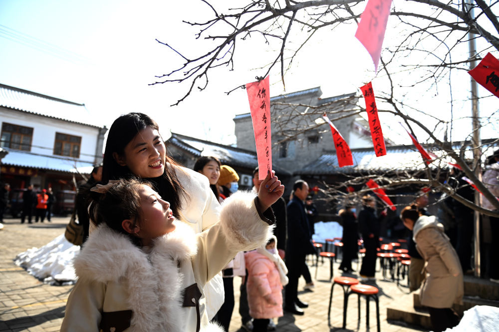 2月22日,小朋友在河北省邯郸市邯山区河沙镇镇南街村里猜灯谜。新华社发(胡清华摄)
