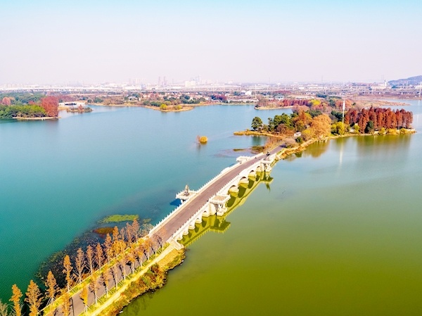 此外,在双湖桥南端数十米区域内,新建了一个石矶长滩景点。这里的坡岸经过改造后,有一段岸边为缓坡草地,上面缀以置石自然入水,中间一段则设置为台阶,游客可在此零距离亲水。