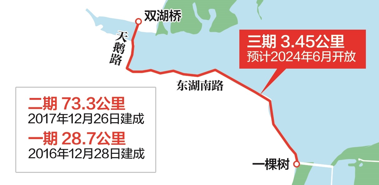 东湖绿道三期起于双湖桥,止于风光村一棵树转盘,全长3.45公里,以“书香道”为主题,将实现机动车道、骑行道、步行道三道分流,更好地让市民游客感受湖光山色、品味文化底蕴,预计2024年6月对公众开放。