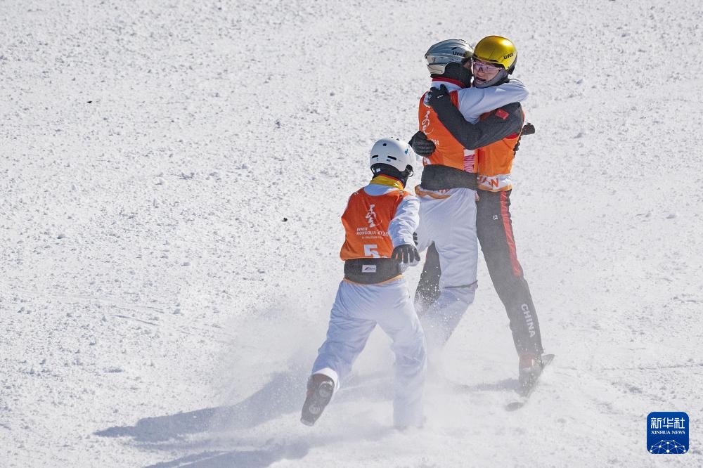 2月23日,吉林队选手李天马(右)在落地后和队友拥抱。新华社记者 谢剑飞 摄