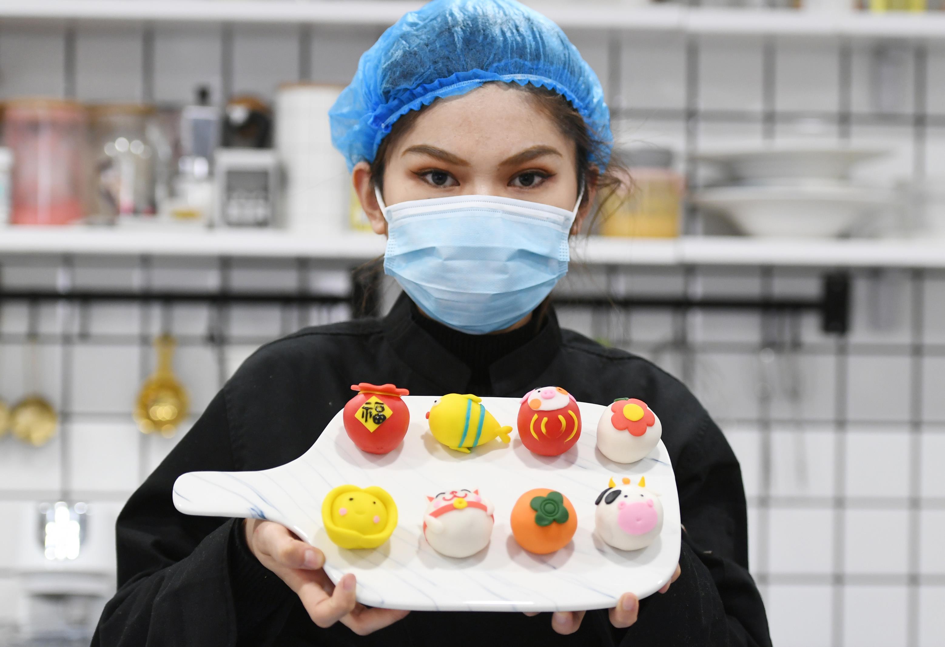 烘焙师展示制作好的创意“祈福”汤圆