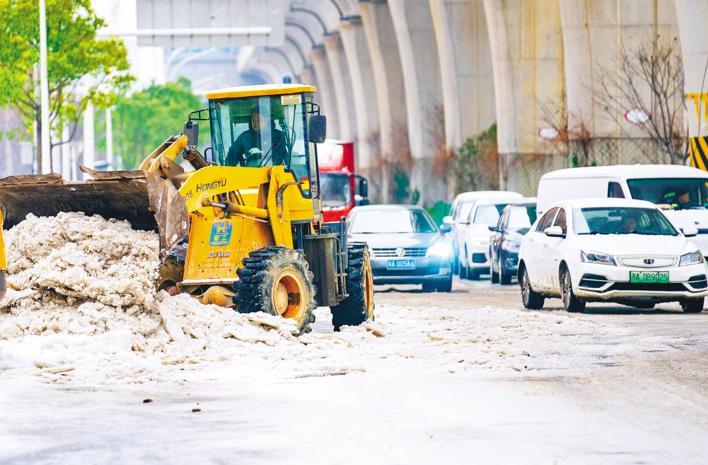 2月23日,武汉市洪山区烽胜路,几台工程机械在奋力铲除路上积存的冰雪。(湖北日报全媒记者 魏铼 摄)