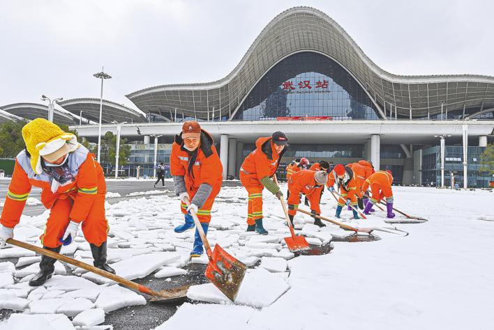 2月23日上午,武汉站东广场上,20名环卫工人用铁铲砸碎地面的冰雪。(湖北日报全媒记者 朱熙勇 摄)