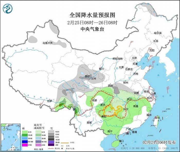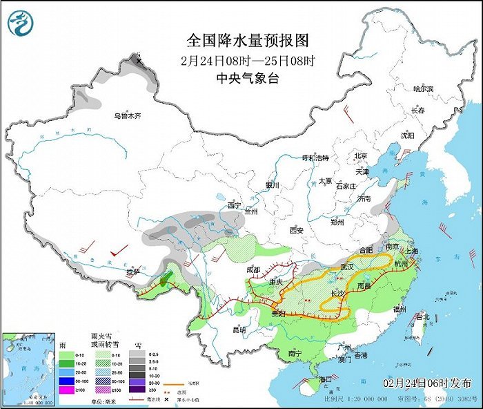 央视网消息:中央气象台网站2月24日消息,昨日,河南、安徽、四川等地部分地区出现了明显的雨雪天气,湖北、湖南及贵州部分地区出现冻雨。近期我国大部地区气温偏低,南方部分地区有雨雪冰冻天气,公众需持续做好防寒保暖,外出警惕雨雪冰冻天气造成的路面湿滑,注意交通安全。