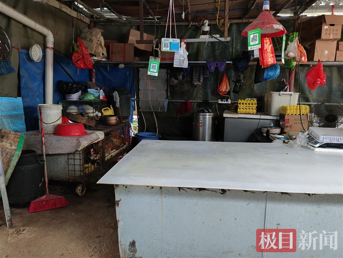 23日下午,记者来到张勇在三民岛民立村市场开的家禽档。档口面积只有5平方米左右,上面盖着帐篷,显得有些简陋,操作台面铺着台布,十分干净,杂物台上也摆放着秤台和一摞摞鸡蛋。左边摆放着一个两层鸡笼,里面有十多只鸡。