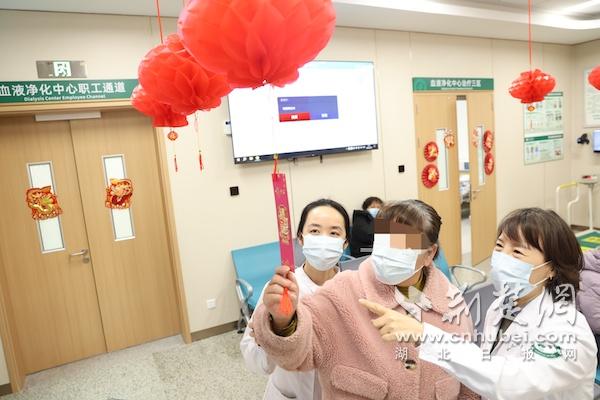 当天一早,武汉市中心医院杨春湖院区血液净化中心的医护人员把血透室布置一新,一个个红色的灯笼、可爱的龙年吉祥物、五彩缤纷的气球……让血透室充满了节日的热闹氛围。