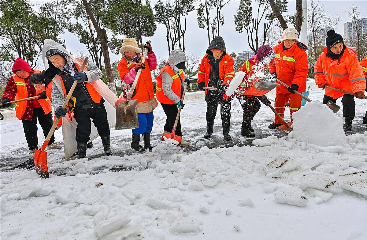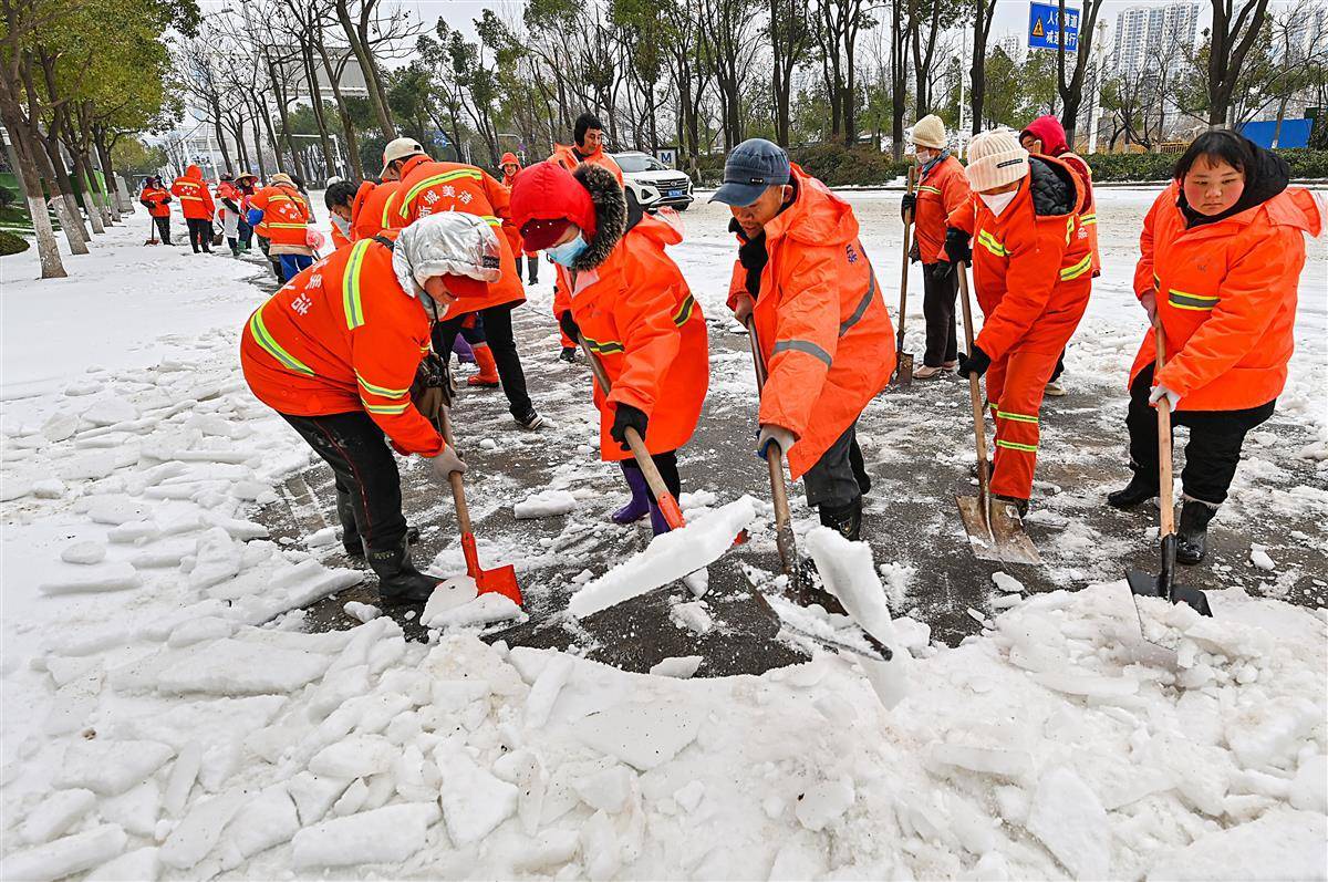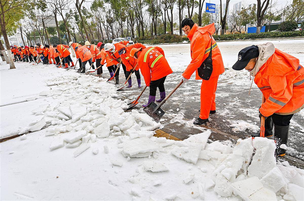 2月23日上午,在仁和路与武汉站之间的团结大道上,20余名环卫工人用铁铲砸碎行人道地面的冰雪,旨在打通这条通往武汉站的人行通道,护航旅客出行安全。