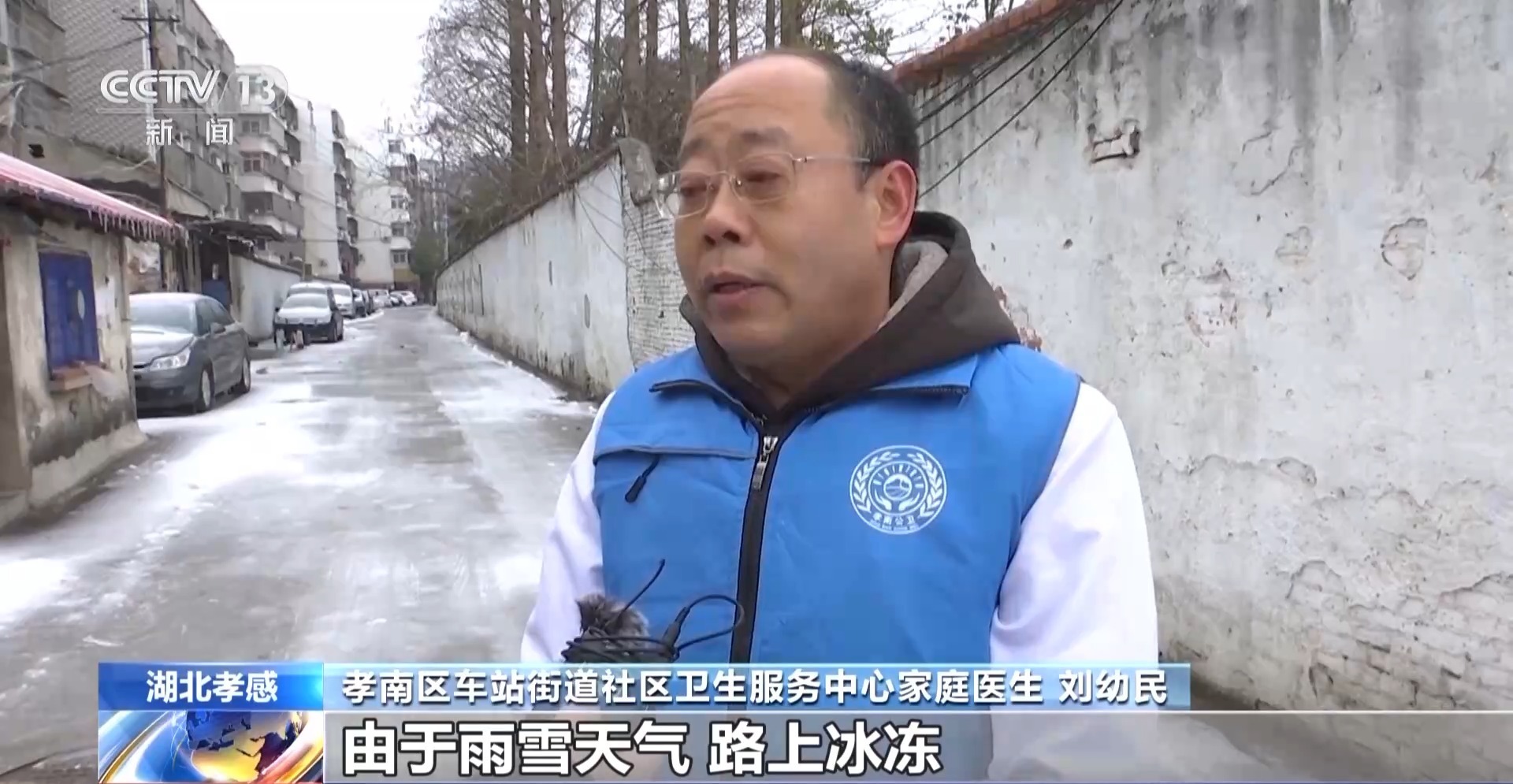 孝南区车站街道社区卫生服务中心家庭医生 刘幼民:由于雨雪天气路上冰冻,一些残障人士和孤寡老人出门不方便。我们医院定期会送医送药上门,解决老人的后顾之忧。