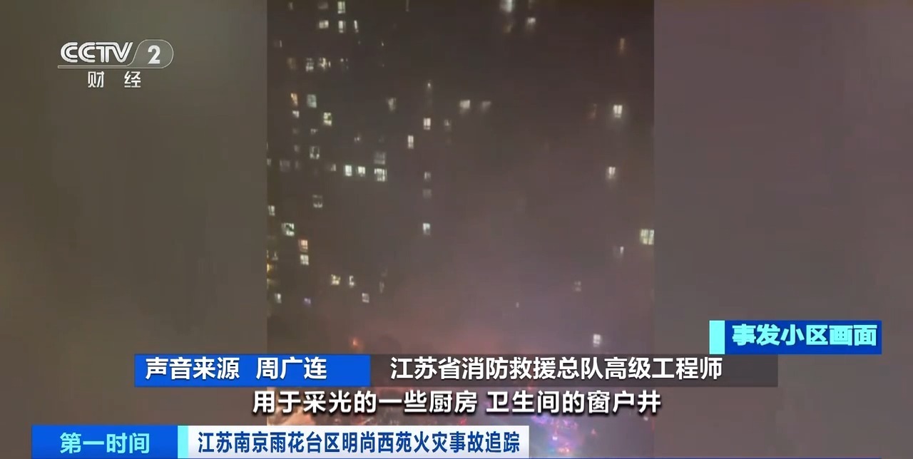 江苏省消防救援总队高级工程师 周广连:天井是住宅里用于采光的,由于相对隐蔽,很多业主会在里面堆放杂物。底部起火后,把每层外窗上防盗栏里的可燃堆放物引着,形成梯次向上迅速蔓延。还有一个是建筑外保温层,如果时间长了,破裂之后,也会把可燃的外保温层引着,形成快速裂变燃烧。底部起火后有一个巨大的烟囱效应的拔风,然后在烟囱壁上又分布着多个可燃物聚集的点位,引起局部的猛烈燃烧,又通过窗户进入室内,引发了室内火灾,所以显得火点分散在多个部位,这会带来更严重的后果。