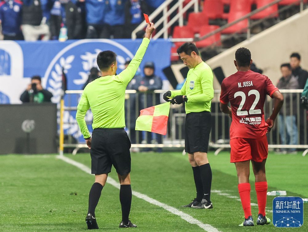 ↑主裁判李海新(左)在比赛中向上海海港队球员尤萨(右)出示红牌。
