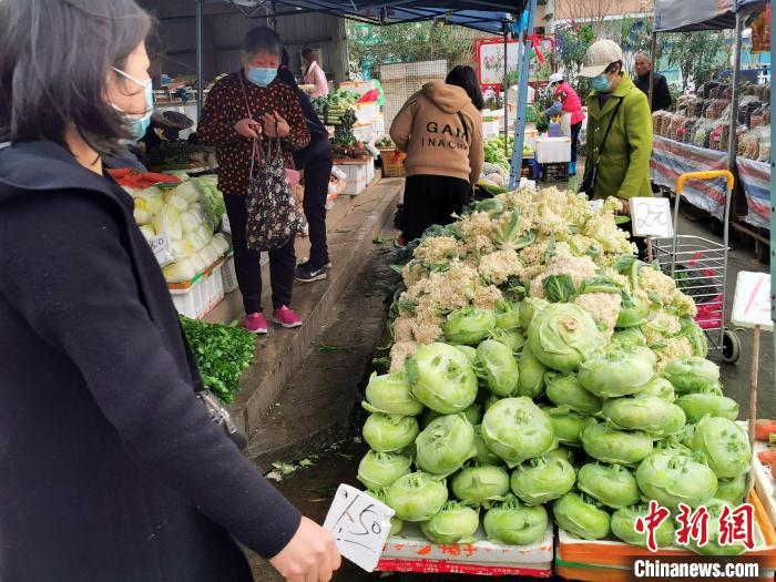 2月24日,广东台山台城街道新宁市场,一菜档将“菜果”摆在显眼位置招揽顾客。李晓春 摄