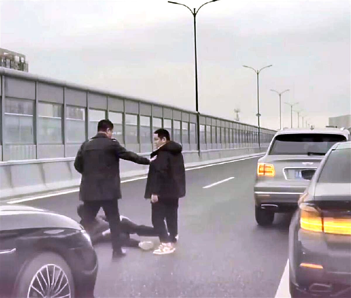 网上流传的视频显示,在一条高架上,一辆黑色宝马轿车和前方的宾利车疑似发生矛盾,宾利车司机下车拍打宝马车窗,宝马司机下车后,两人发生争执。视频中,宾利司机手持一件尖锐物体,多次向宝马司机捅划,并将其打倒。在宝马司机倒地后,宾利司机又接连殴打,用脚踢踹其头部。一名路过的比亚迪车主见状,立即下车上前劝阻,4次用身体护住伤者。