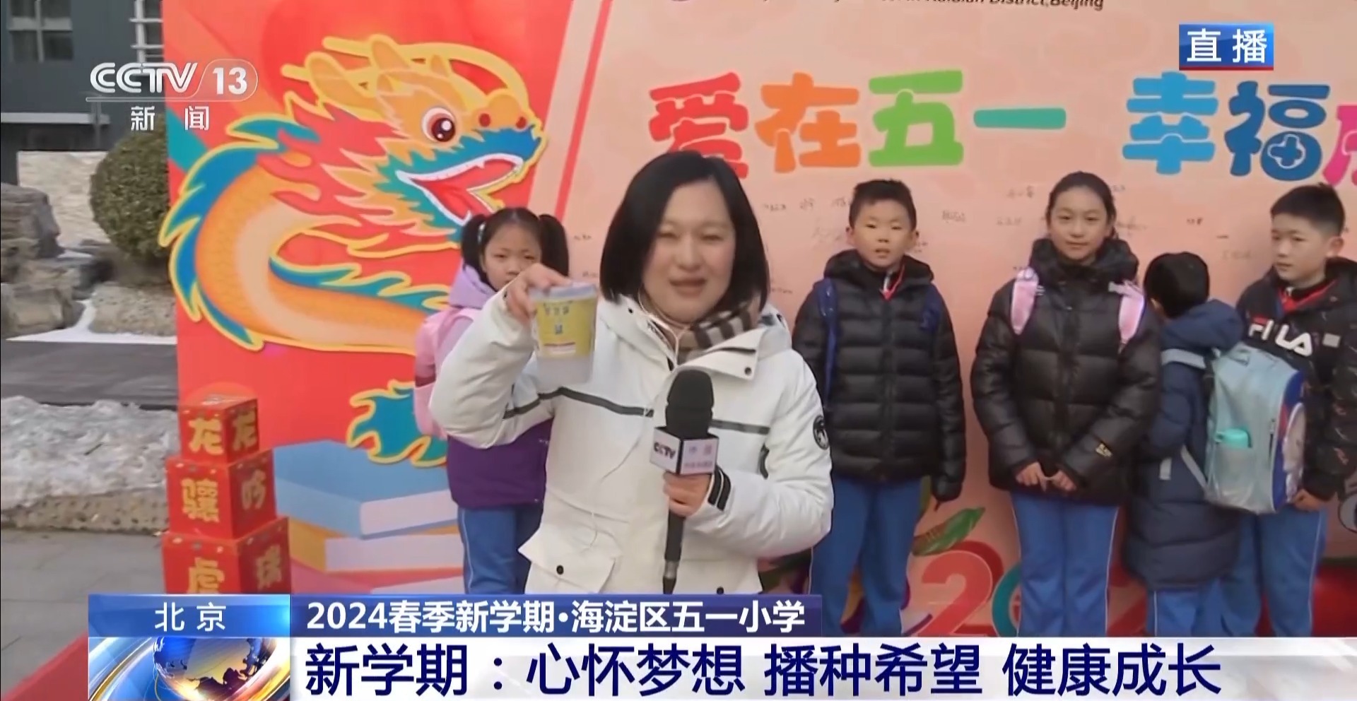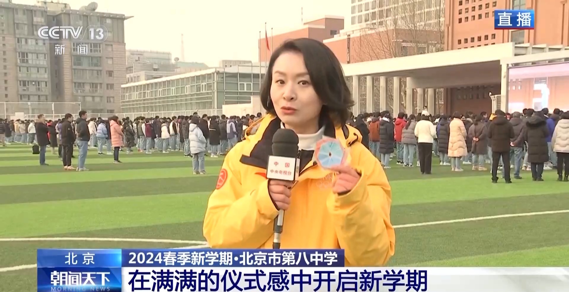 总台央视记者 李晶晶:北京市第八中学高中部,近2300名高中生齐聚国旗下,举行新学期的第一次升旗仪式,在满满的仪式感中开启新的学习生活。今年是龙年,有句祝福语叫“龙行龘龘,前程朤朤”,现在正在进行的国旗下的演讲,题目就是《龘龘朤朤间是向上的力量》,老师祝福学生们像龙一样腾飞而上,同时也是鼓励他们要有梦想,为实现梦想不断努力向上。
