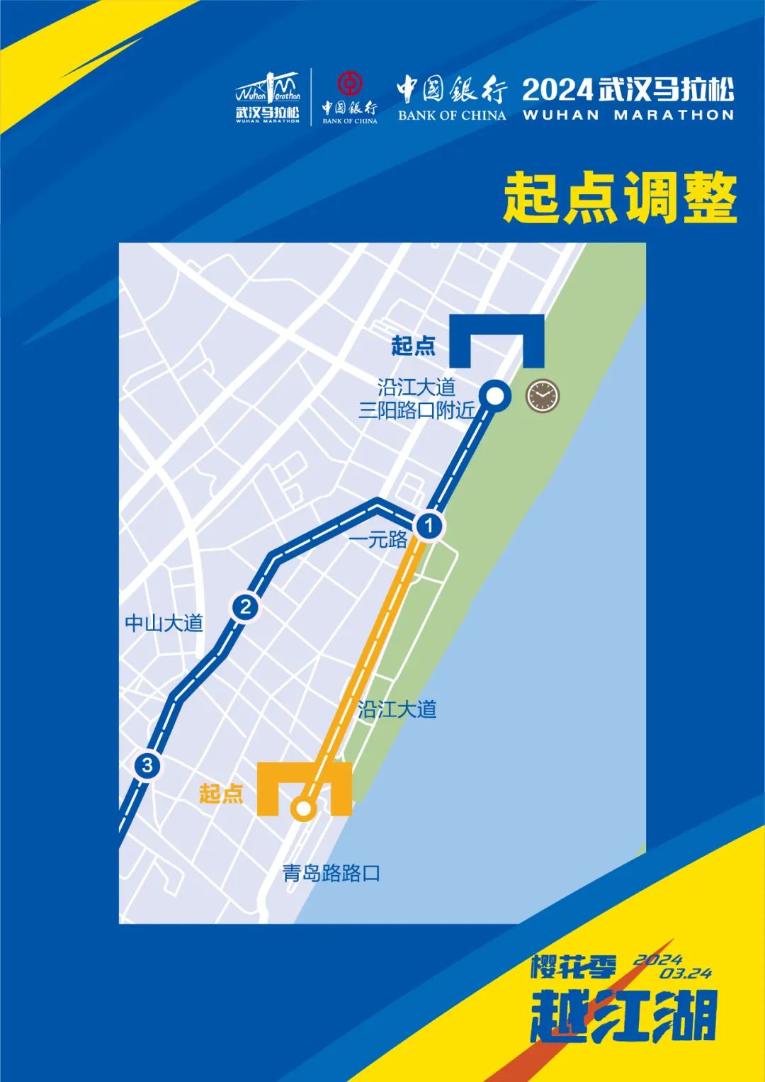 为配合“城市大阳台”改造工作,2024武汉马拉松起点从江汉路沿线调整到沿江大道三阳路口附近。
