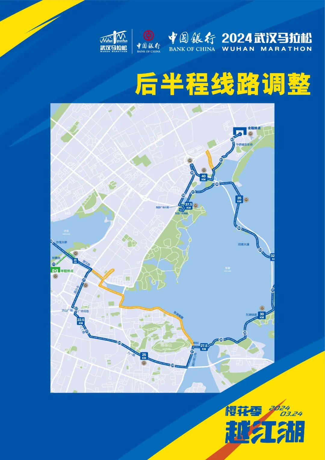 同时,因东湖绿道三期施工占道等原因,相比往届赛事,赛道后半程进行较大调整,即:原赛道由起点出发经沙湖大桥至白鹭街转入东湖南路后进入东湖绿道,调整为沙湖大桥→中北路→洪山广场→八一路,并由一棵树进入东湖绿道直至终点欢乐谷。其中后半段位于银杏原路的折返因距离原因拟调整至梨园广场南通道。