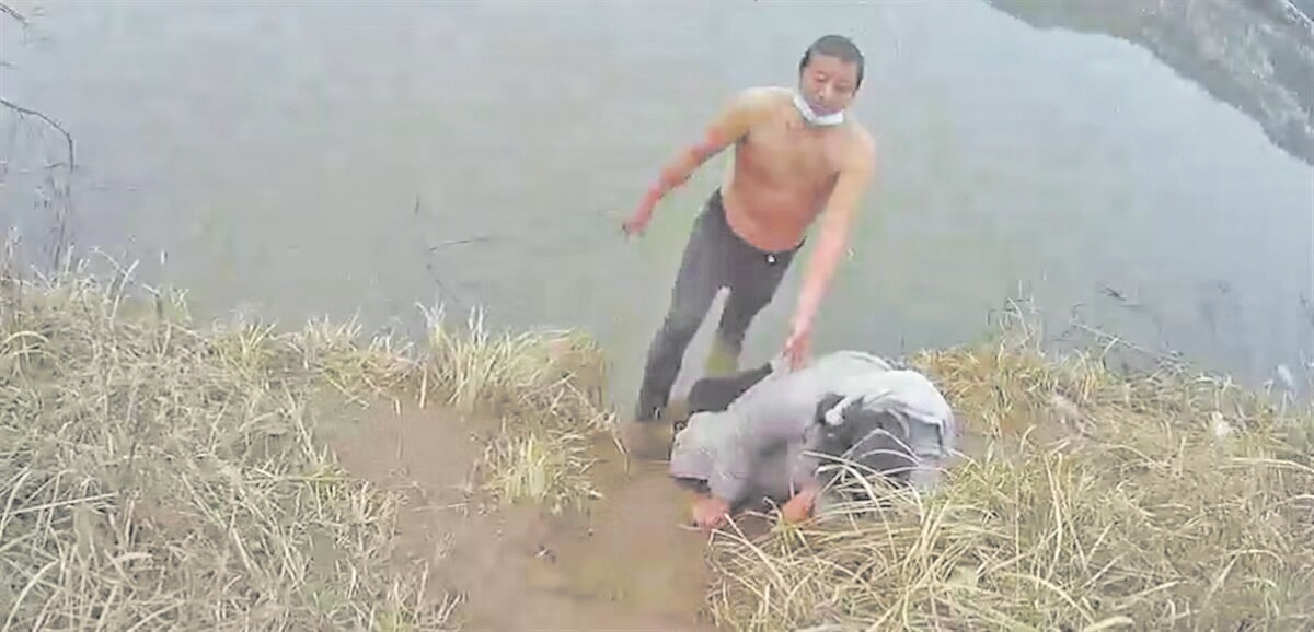 “不好,有人落水了!”来不及多想,也顾不得寒意,武庆涛连忙脱掉笨重的棉衣,光着膀子跳入了水中,奋力地将母女两人往岸边拉。