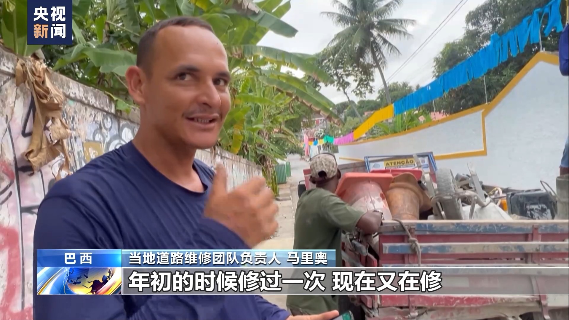 当地道路维修团队负责人 马里奥:年初的时候修过一次,现在又在修。因为下雨造成交通堵塞,一辆重型汽车从这里强行经过,结果道路损坏,我们只能抓紧修理。