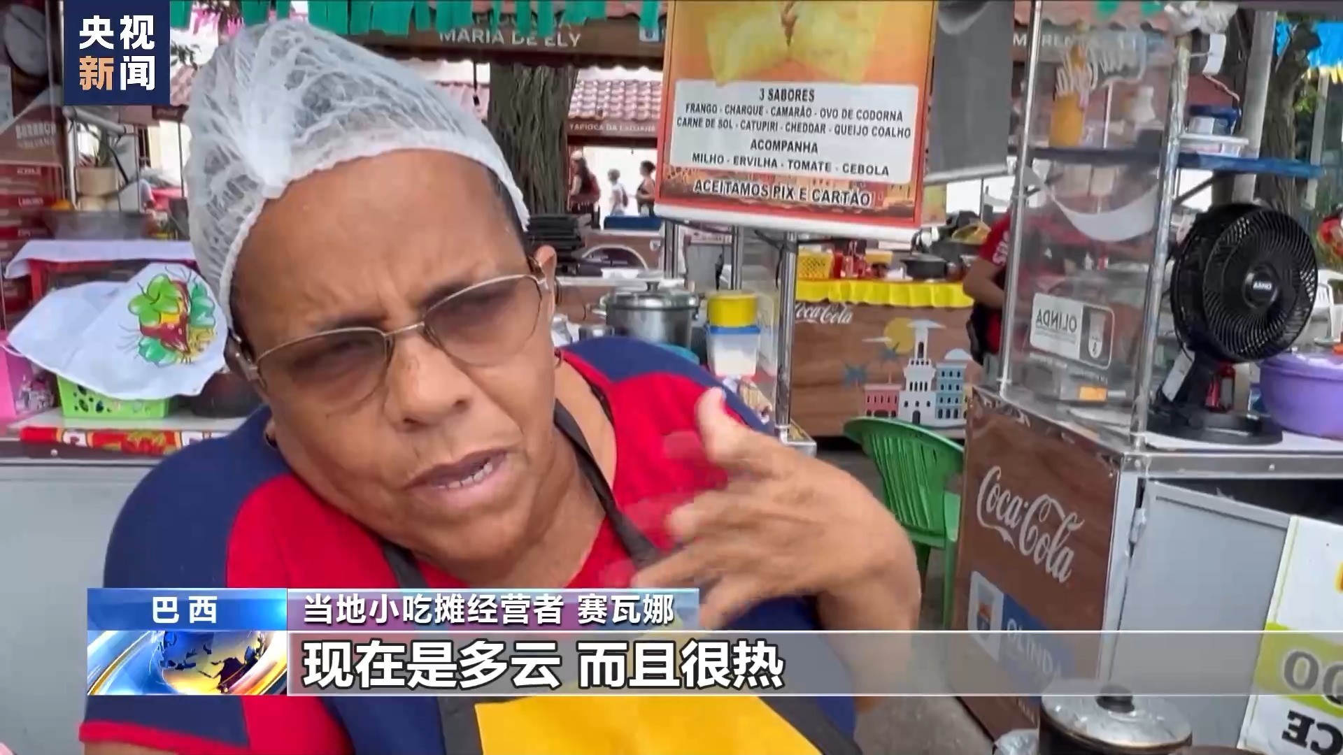 当地小吃摊经营者 赛瓦娜:现在是多云,而且很热。但愿今天不会下雨,早上下雨还好些,因为下午我们要出摊赚钱。