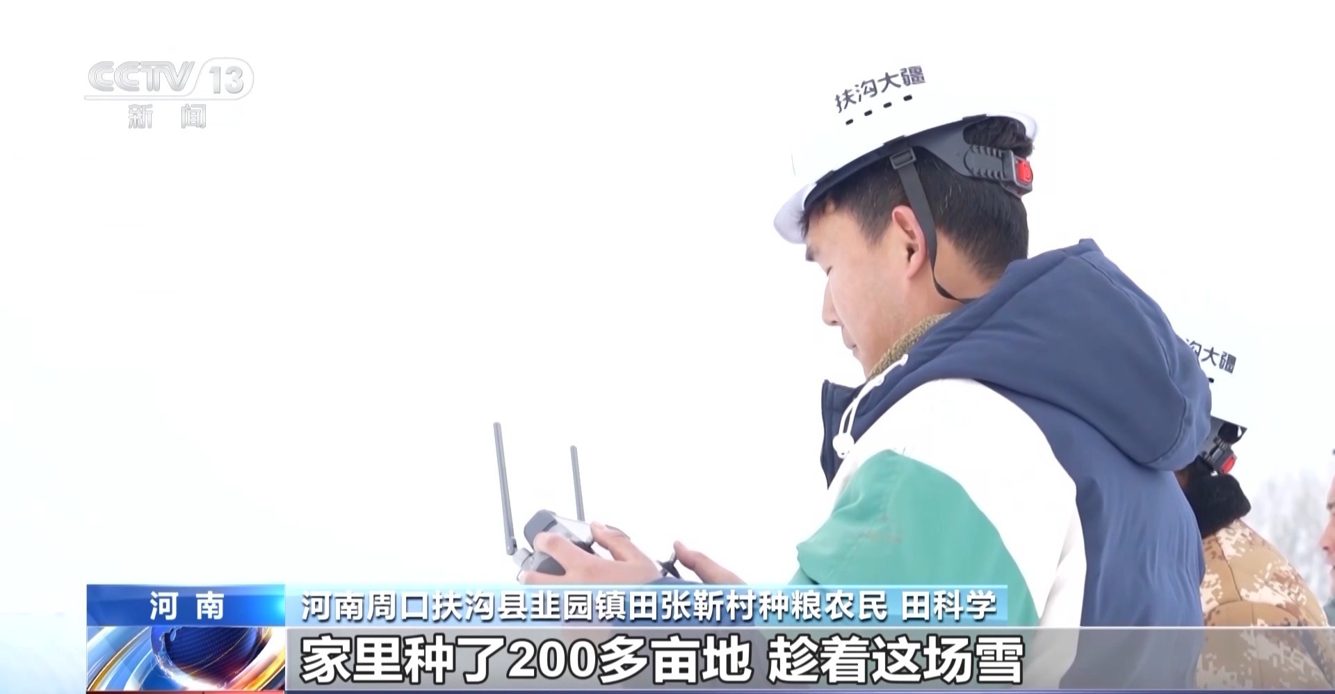 河南周口扶沟县韭园镇田张靳村种粮农民 田科学:家里种了200多亩地,趁着这场雪,刚才用无人机撒化肥,两三个小时活都干完了。