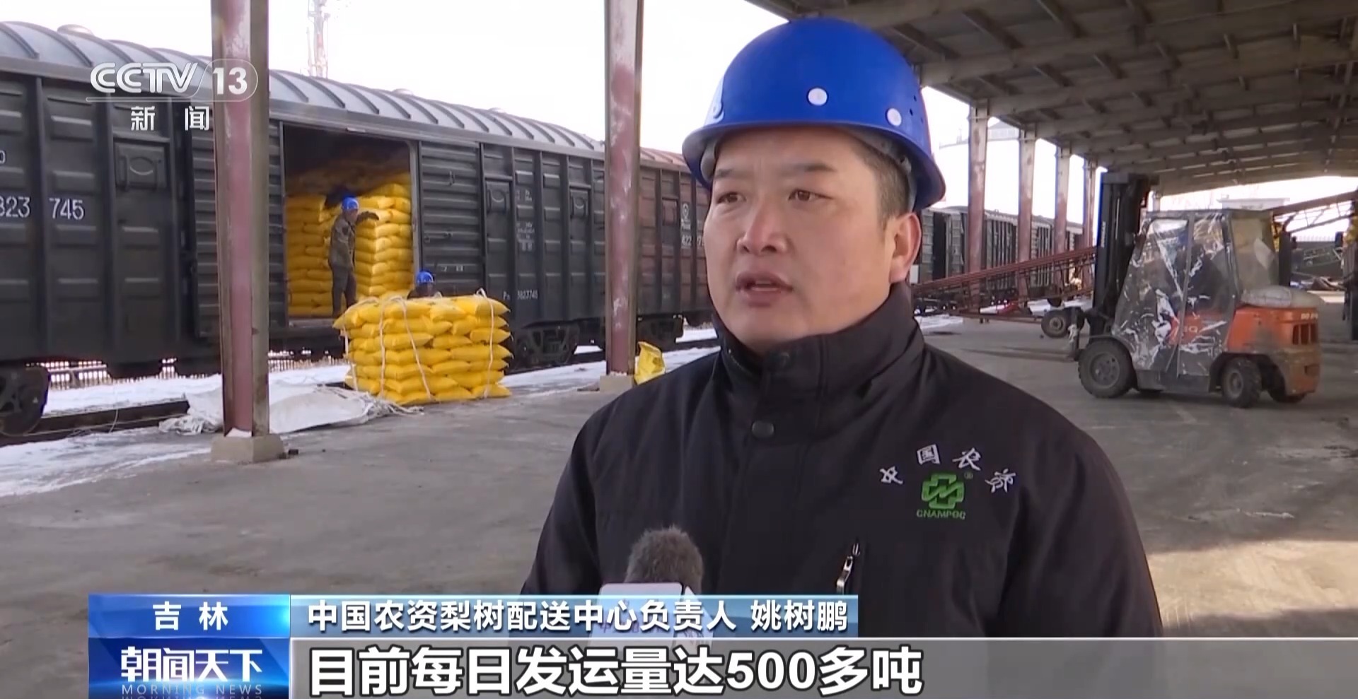 中国农资梨树配送中心负责人 姚树鹏:提高作业进度,目前每日发运量达500多吨。