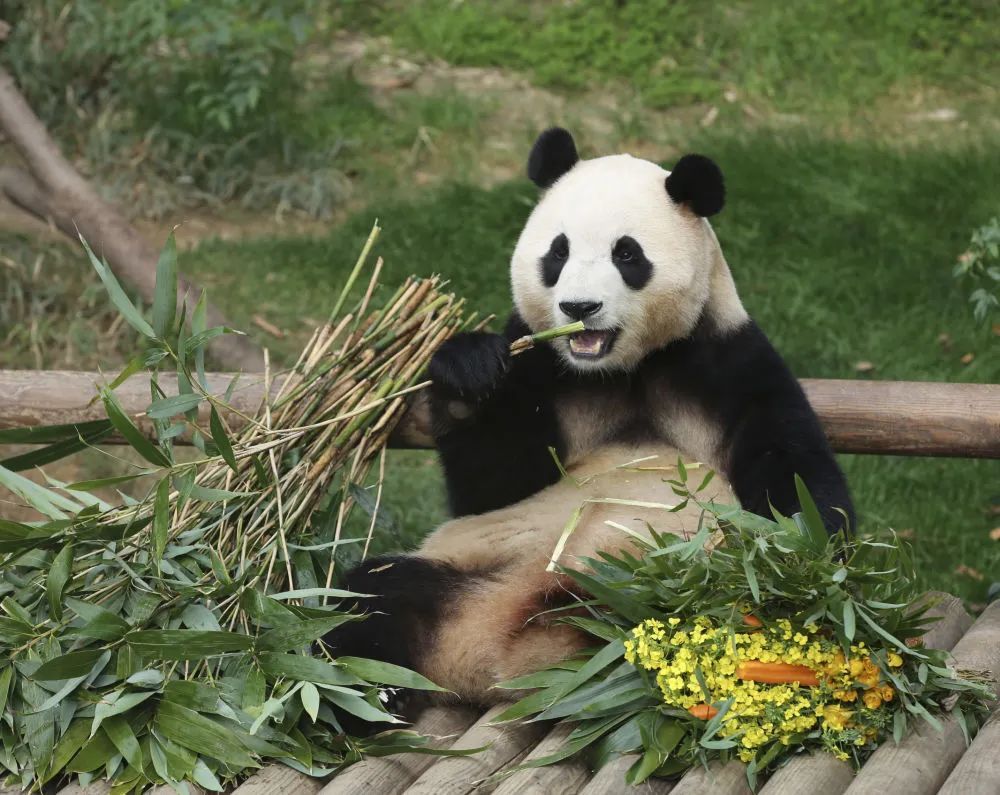 3月3日,大熊猫“福宝”在位于韩国京畿道龙仁市的爱宝乐园享用美食。新华社记者 姚琪琳 摄