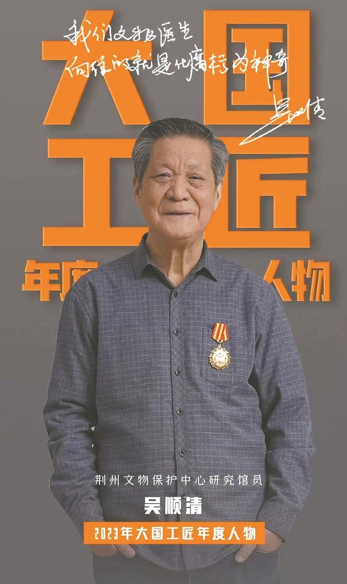3月1日晚,由中华全国总工会、中央广播电视总台主办的2023年“大国工匠年度人物”发布活动,揭晓10位“大国工匠年度人物”,荆州文物保护中心研究馆员吴顺清成功当选,为历届以来湖北省荣膺此项荣誉的第二位。