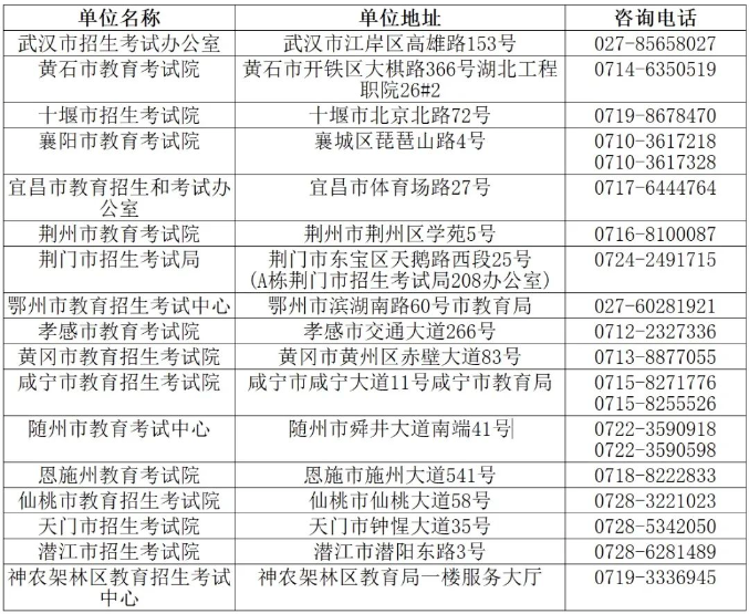 备注:报名期间,各县(市、区)教育考试机构接受考生咨询与服务,考生可登录各市州教育考试机构官网或致电市州教育考试机构查询了解咨询电话。