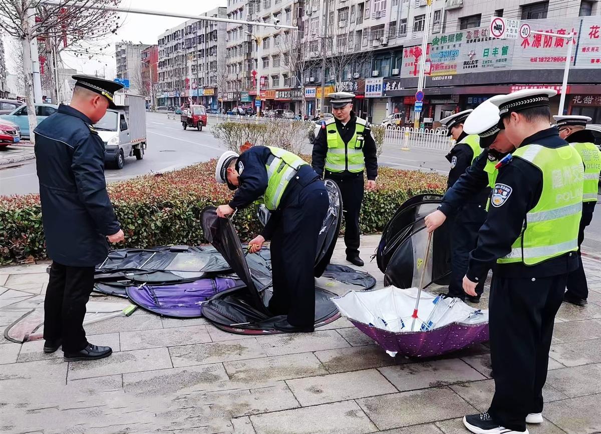 同时,执勤民辅警会同市场监督管理部门,加大对电动车、摩托车销售部门的宣传和管理力度,通过上门约谈、走访商家、张贴整治通告、发放传单、清理、收缴商家仓库储存的各类伞篷,坚决制止违规加装伞篷的经营和服务行为。通过“报、网、电、微、端”等平台广泛宣传整治行动,积极争取社区街道、单位支持,联合开展“敲门行动”,入户面对面开展宣传劝导,号召更多的居民主动拆除伞篷,戴好头盔,遵守交规,文明出行,助力随州文明城市、国家卫生城市创建。