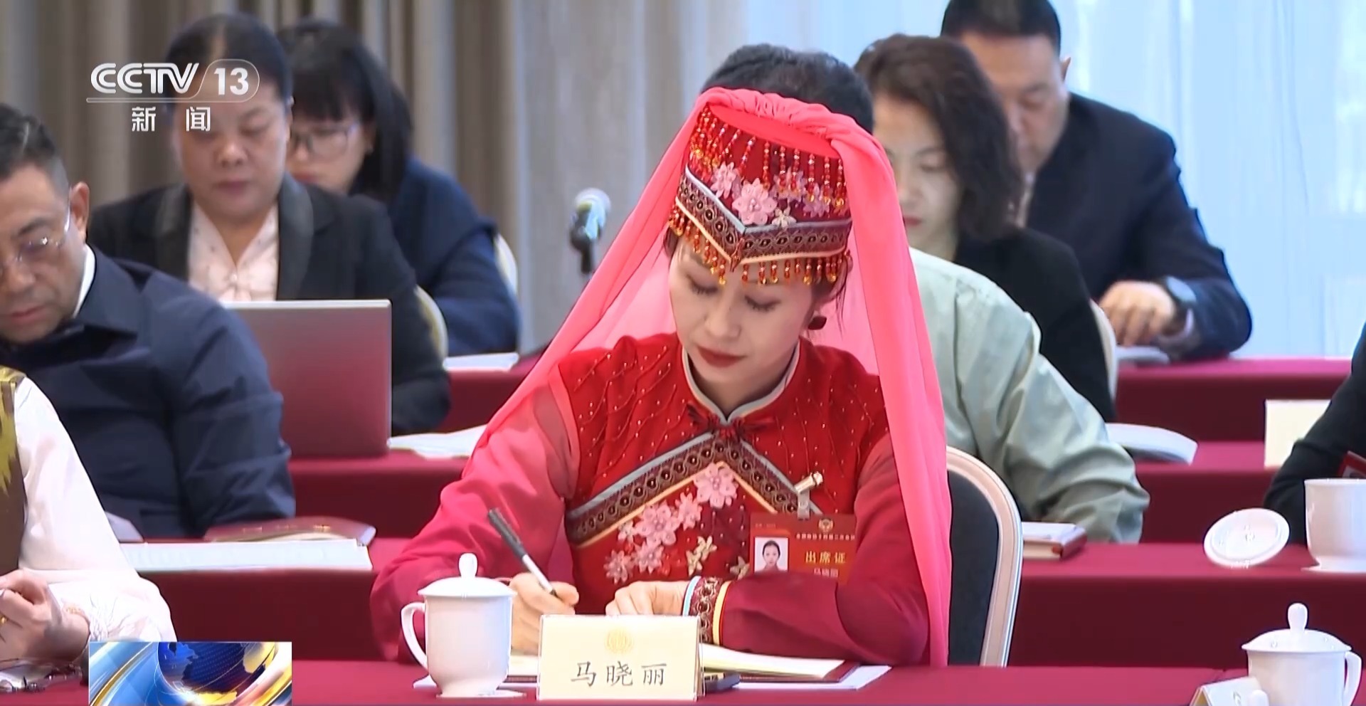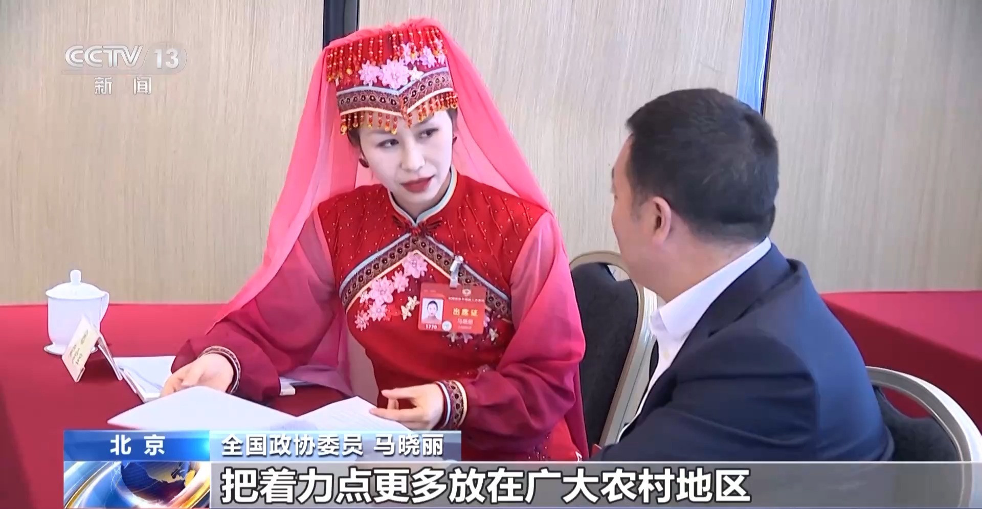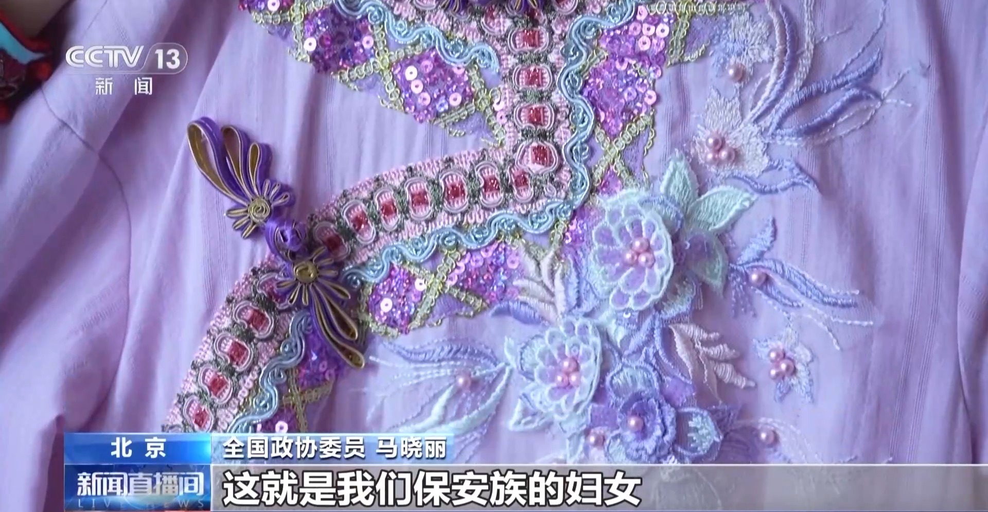 全国政协委员 马晓丽:这是我们保安族特有的传统服饰。这就是我们保安族的妇女一针一线绣出来的,这也是乡村振兴的一个项目,因为我们保安族的妇女都在家里,就近就业,同时能照顾到老人孩子。我也是带着她们的心愿,带着她们的期待,穿着她们给我做的衣服来参加全国两会,非常自豪。