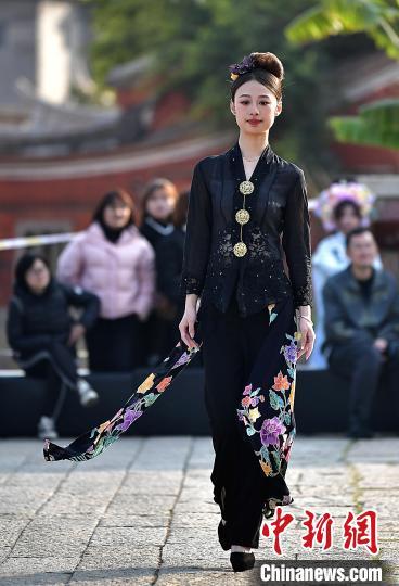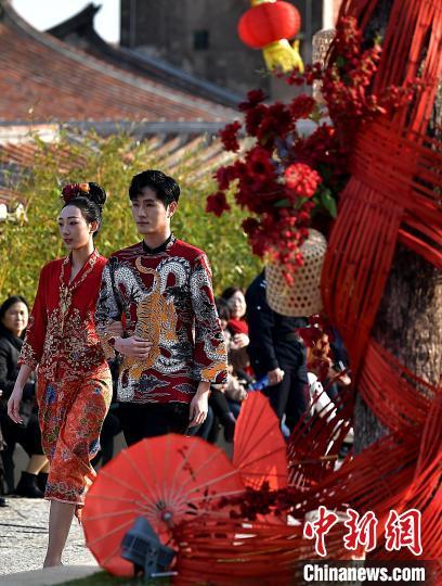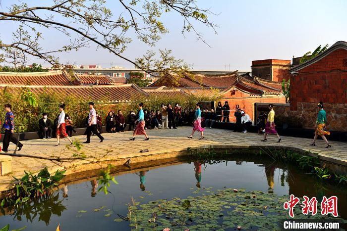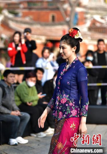 图为3月8日,模特在晋江梧林传统村内走秀,展示新加坡娘惹服装设计师设计的服装。 中新网记者 张斌 摄