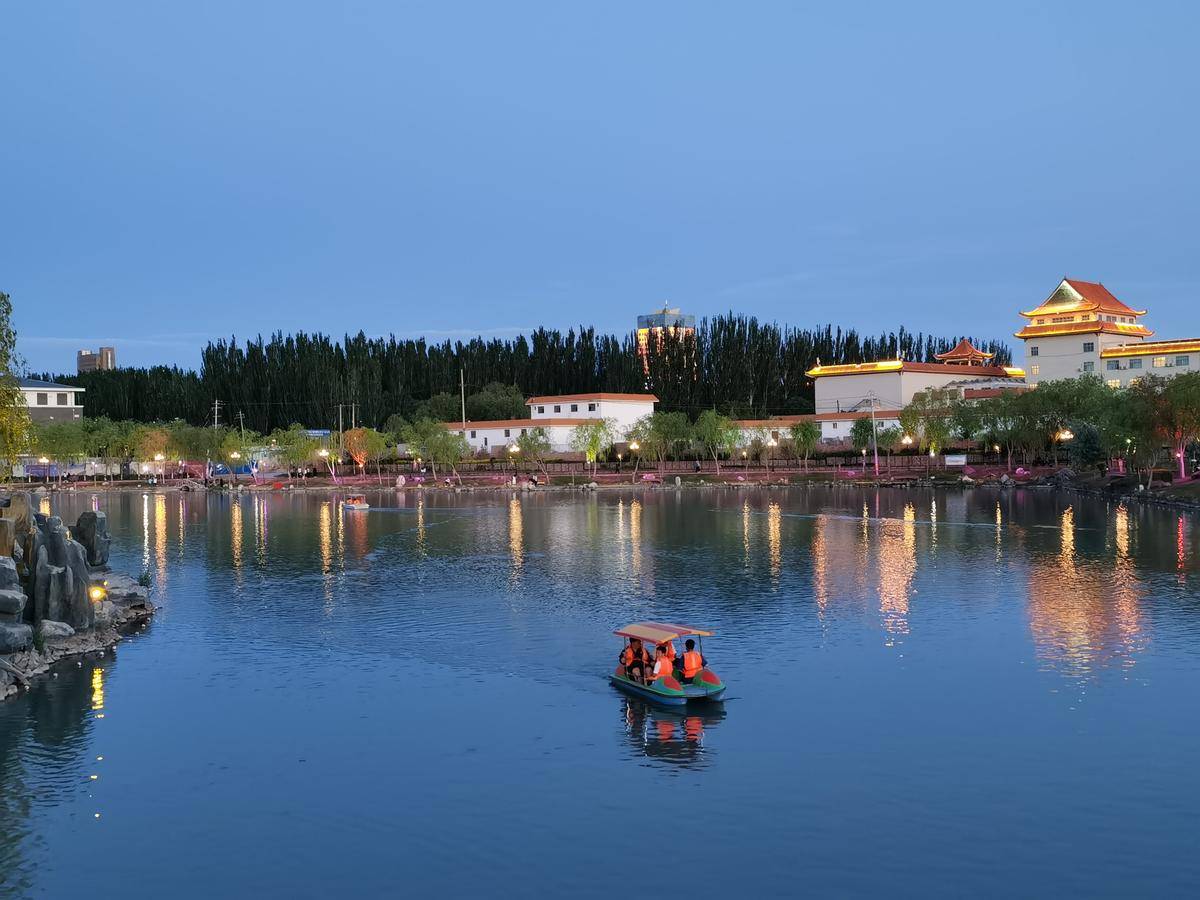 玉门市玉泽湖公园内市民泛舟湖上。新甘肃·甘肃日报记者 蔡文正 摄
