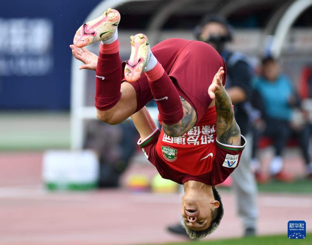 3月9日,河南俱乐部酒祖杜康队球员纳萨里奥后空翻庆祝进球。