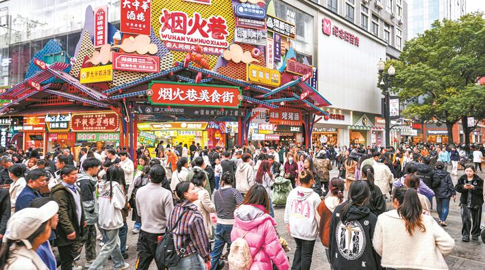 3月10日,春光明媚,气温回暖。繁华热闹的汉口江汉路步行街,人群熙熙攘攘,市民走出家门品美食、逛商场,消费热情高涨。楚天都市报极目新闻记者李辉摄影报道