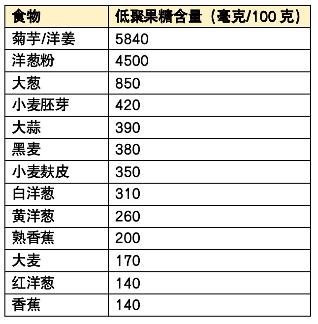 常见食物中低聚果糖的含量