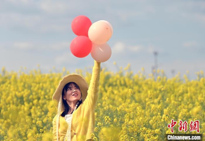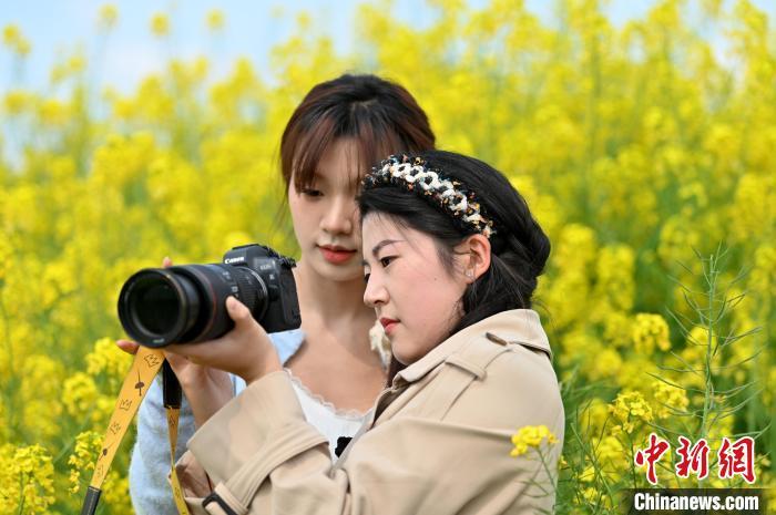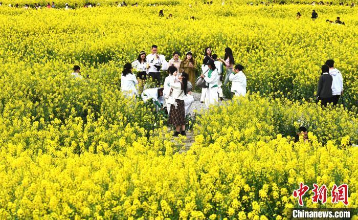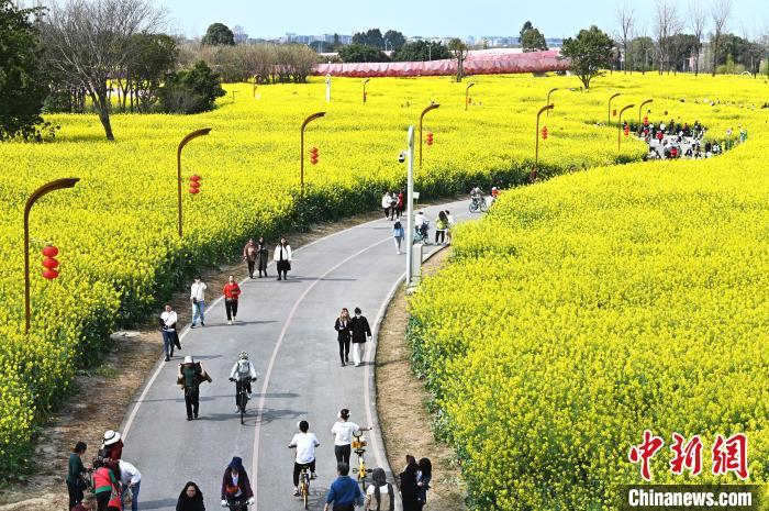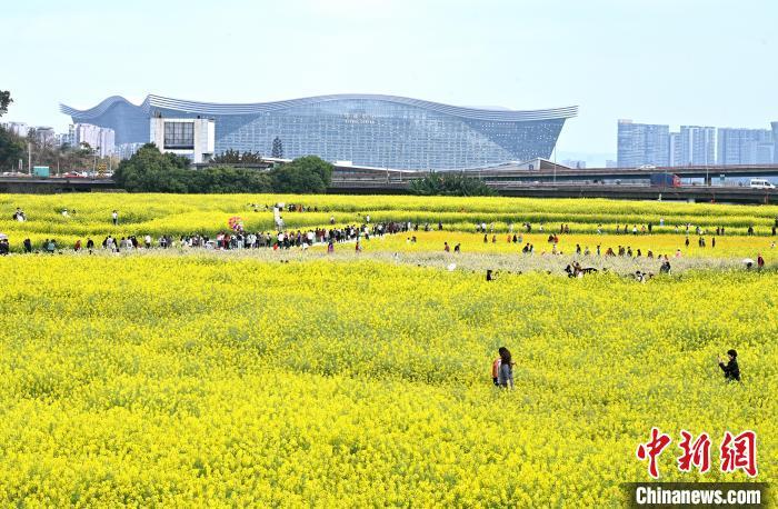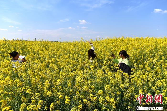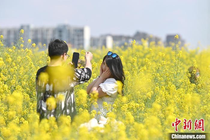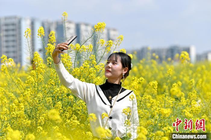 3月13日,位于成都高新区的交子百业园里的油菜花绽放,弥漫着浓浓的春意,吸引不少游客前来打卡拍照。