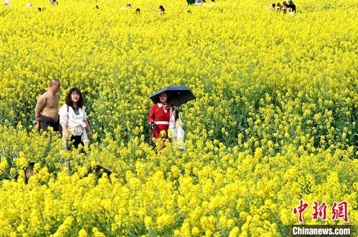 游客在油菜花田里游玩。记者 安源 摄