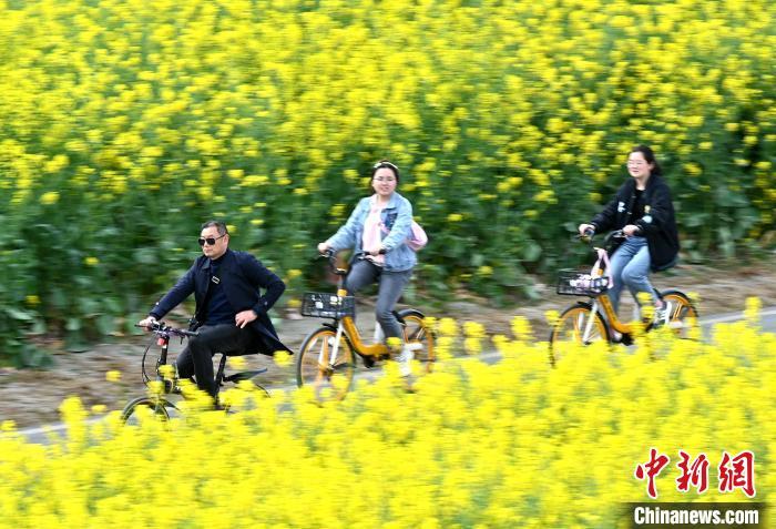 游客在油菜花田旁骑行。记者 安源 摄