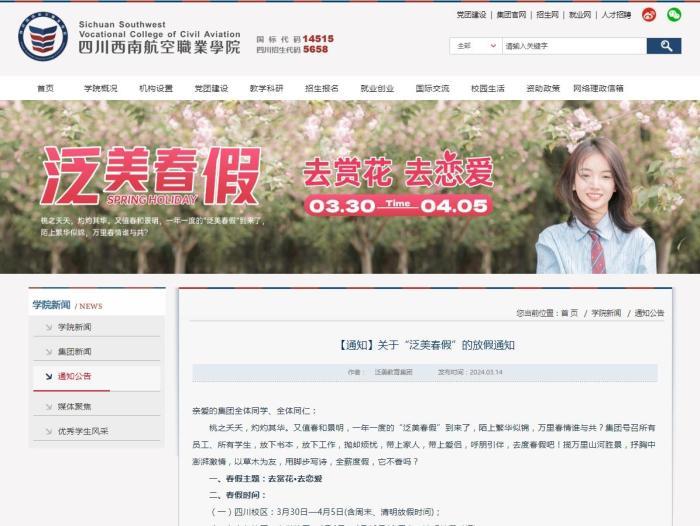 中新网成都3月14日电 (记者 何浠)四川西南航空职业学院3月14日发布《关于“泛美春假”的放假通知》,该通知安排全校师生3月30日至4月5日放7天春假(含清明放假时间),并号召所有员工、所有学生,放下书本,放下工作,带上家人,带上爱侣,呼朋引伴,去度春假。