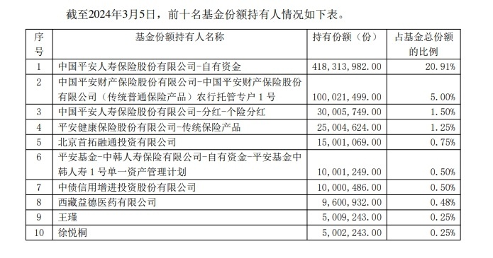 对于中证A50指数,究竟受到哪些投资者青睐呢?以平安中证A50为例,《上市交易公告书》中提到,截至3月5日,机构投资者持有的基金份额为7.17亿份,占总份额的35.86%。前十名份额持有人中,平安人寿以自有资金认购4.18亿份,占比20.91%;平安财险(传统普通保险产品)农行托管专户1号认购1亿份,占比5%;平安人寿分红险、平安健康传统保险分别认购3000.6万份、2500.5万份。