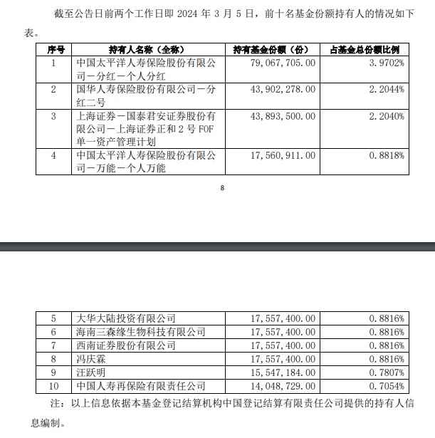 对于险资、券商出现在前十大份额持有人中,在萨摩耶云科技集团首席经济学家郑磊看来,这表明这两类机构对中证A50指数的未来表现充满信心,认为该指数具有较好的投资价值。同时,这也说明中国资本市场的投资环境在不断改善,吸引了更多类型的投资者参与。