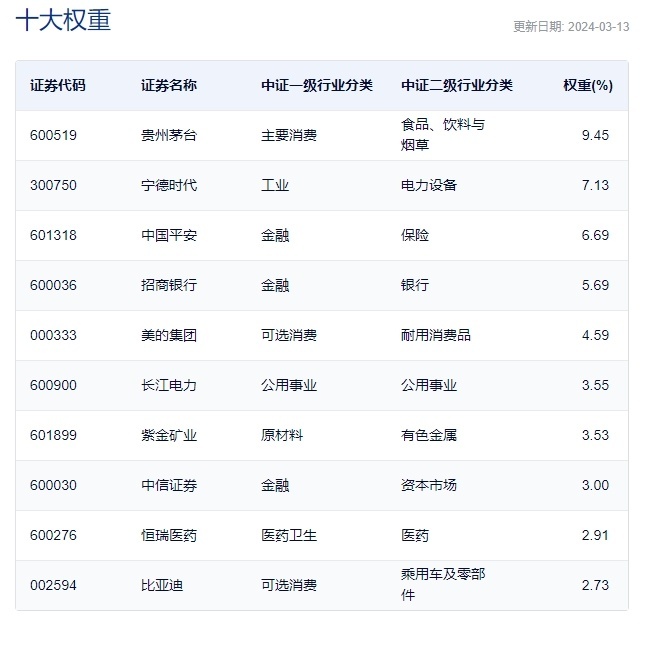 在指数编制方面,中证A50指数还突破性引入ESG可持续投资理念,将“剔除中证ESG评价结果在C及以下的上市公司证券”作为样本选择考虑因素之一。最新数据显示,中证A50指数前十大权重股依次为贵州茅台、宁德时代、中国平安、招商银行、美的集团、长江电力、紫金矿业、中信证券、恒瑞医药、比亚迪。按照中证一级行业分类,这些股票涉及领域有主要消费、工业、金融、可选消费、公用事业、原材料、医药卫生。