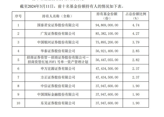 再者,华泰柏瑞中证A50ETF份额持有人结构中,截至3月11日,机构投资者持有份额占比45.39%。此外,前十名份额持有人中,包括国泰君安证券、广发证券、中国银河证券等8家券商,还有中金公司及招商资管红旭FOF1号单一资产管理计划。