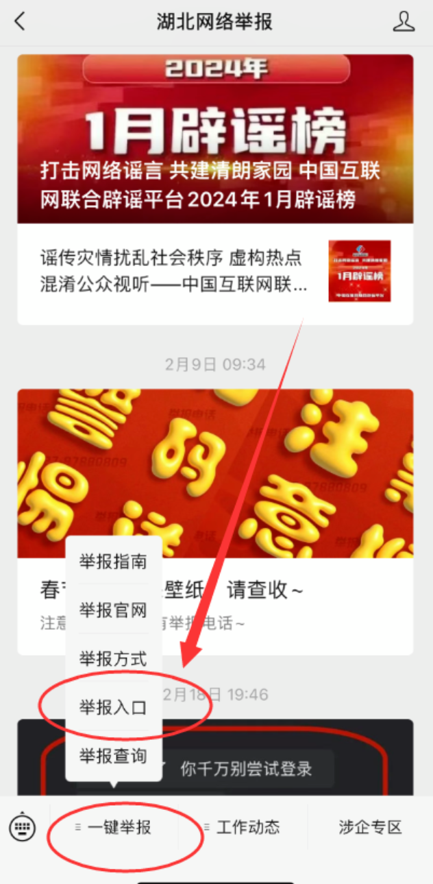 (3)搜索关注微信公众号“湖北网络举报”,进入菜单栏,点击“一键举报”-“举报入口”进行举报