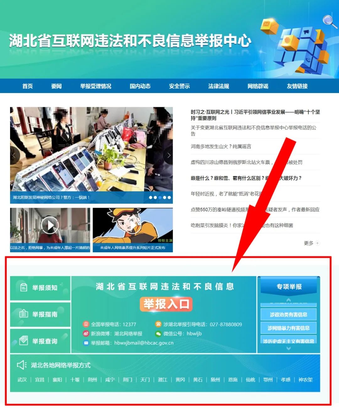 (1)登录湖北省互联网违法和不良信息举报中心官网:http://hbjubao.cnhubei.com/,进行举报